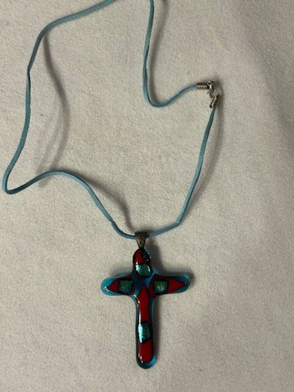 Fused Glass Cross with Dichroic inlay 2 1/2" x 2" with teal chainwith lobster clasp. You can also take chain off and use as tree ornament