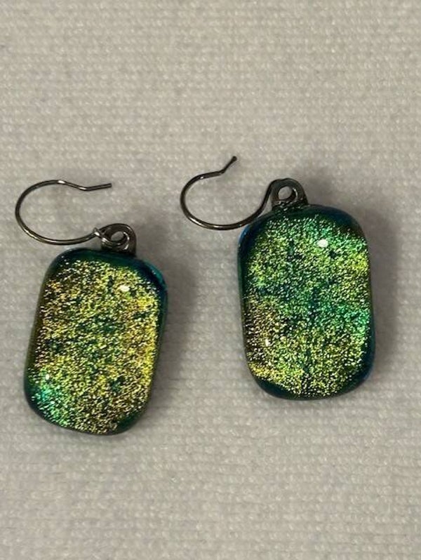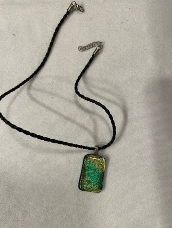 Dichroic Glass Pendant & Earring Set, Green and yellow, Pendant 1 1/2" x 1" Earrings 3/4" x 1" silver findings, Black bradided chain with lovster clasp